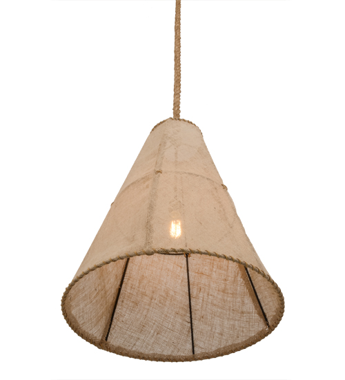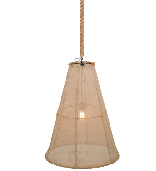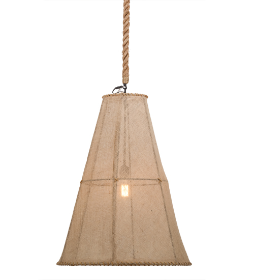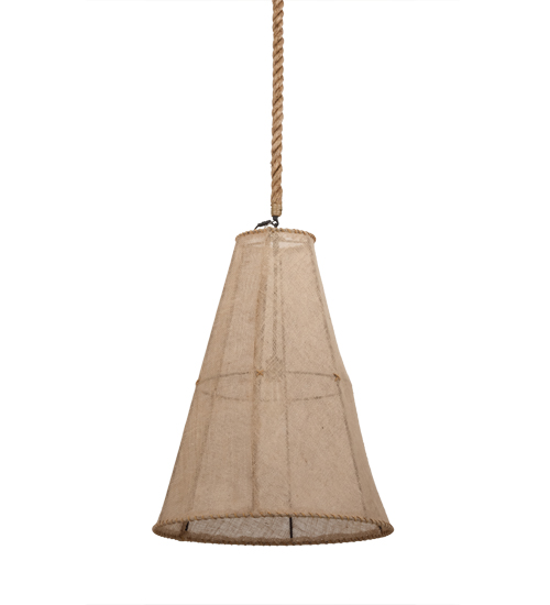 This unique lighting design features a Burlap shade hand woven on a cylindrical shaped frame. The pendant is suspended with a natural colored rope. The fixture is enhanced with a Black finish. Handcrafted in our 180,000 square foot manufacturing facility in Yorkville, NY. Fixture designs, metal finishes and Pendant sizes can be customized to meet your needs. UL and cUL listed for dry and damp locations however we do not recommend installing it in spaces that experience a large amount of moisture due to the fabric shade.