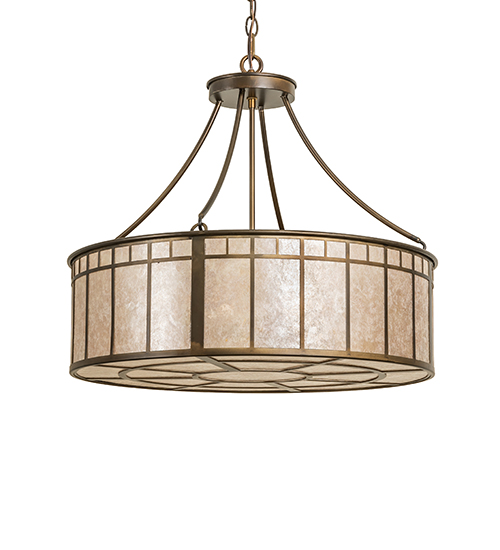 The Glendale Mission Inverted pendant features a continuous band of T-Mission patterns in an Antique Copper finish on an impressive drum-shaped Silver Mica shade with a matching bottom diffuser. Inspired by the famed Arts and Crafts movement in design, this handsome ceiling fixture offers an overall height range from 25 to 60 inches, as the chain length can be easily adjusted on location to accommodate your specific lighting application needs. The Glendale Mission Inverted Pendant is featured in our American-made, American-designed, handcrafted Craftsman Lighting Collection, which is manufactured in Yorkville, New York. UL and cUL listed for dry and damp locations.