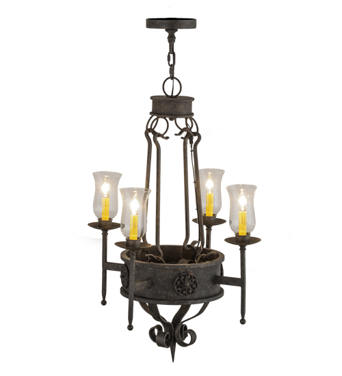 Integrating a rich charm and artistic look, the Lorenzo steel chandelier features floral medallions and is adorned with 4 Clear Hurricane Glass shades revealing Ivory faux candlelights perched on bobeches with long ballpoint arms. The fixture is enhanced with hand forged hardware and a scrolled finial featured in a warm Coffee Bean finish. The fixture is ideal for entryways, dining areas, lobbies and other rooms in a variety of residential and commercial settings. The chandelier is handcrafted by highly skilled artisans in the USA. Options include dimmable energy efficient lamping, as well as custom sizes, styles and colors. The fixture is UL and cUL listed for damp and dry locations.
