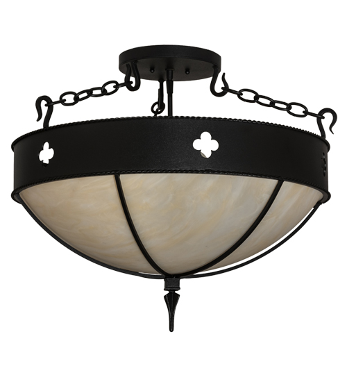 Stylized four leaf clover cutout insignias highlight this attractive ceiling fixture, which features a Sahara Taupe Idalight diffuser with rounded spokes, pointed finial and hardware featured in a Textured Black finish. Handcrafted in the USA, this fixture is available in custom designs, colors, sizes and dimmable energy efficient lamping. The fixture is UL and cUL listed for damp and dry locations.