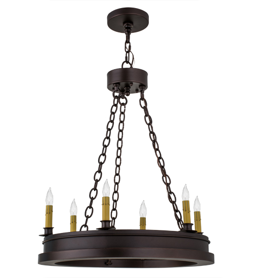 Sophisticated rustic charm with a modern look never looked so good. A solid Mahogany Bronze finished ring is refined with handsome architectural lines and layered design details. Six Ivory faux wax dripping candlelights are perched on smooth round bobeches that provide beautiful ambient illumination. Ideal for entryways, lobbies and as a stunning centerpiece for spaces in residential, hospitality and commercial settings. Overall height ranges from 34 to 82 inches as the chain can be easily adjusted in the field. Domestically manufactured in our 180,000 square foot facility in Yorkville, New York. Customize candlelight colors, metal finishes and fixture sizes to suit your taste. UL and cUL listed for dry and damp locations.