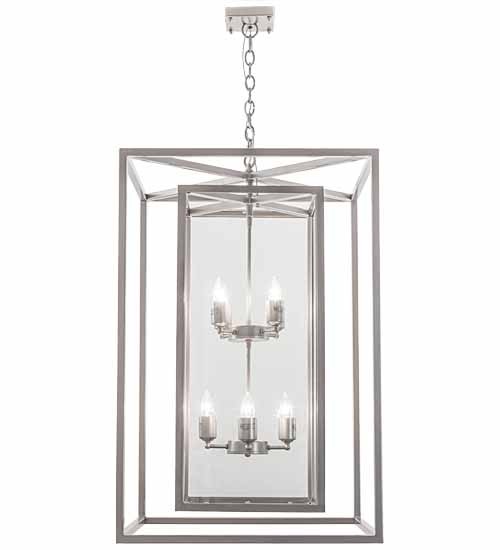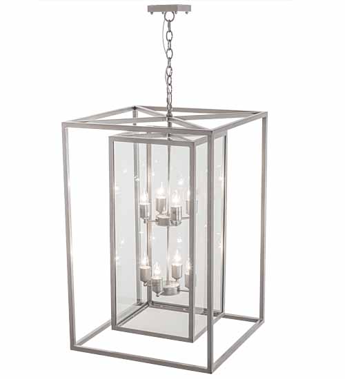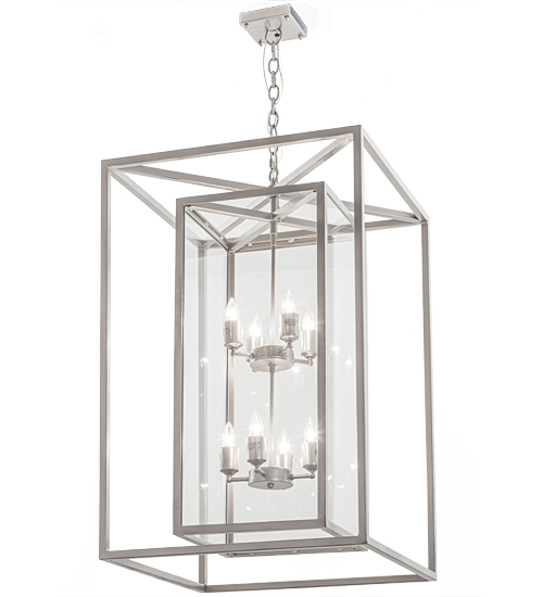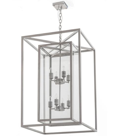A modern, architecturally styled fixture is designed with a pizazz that is unique, fresh and stylish. Give your decor an extra edge with this innovative fixture featuring a Clear Glass encasement within a larger Solid Metal cage. Suspended inside the cage, which is surrounded with a larger metal frame, are 8 complementary faux candlelights. The elaborate geometric frame and hardware are finished in a Nickel powdercoat. Handmade in our 180,000 square foot manufacturing facility in Yorkville, New York Custom options include special sizes, finishes and styles. UL and cUL listed for dry and damp locations.