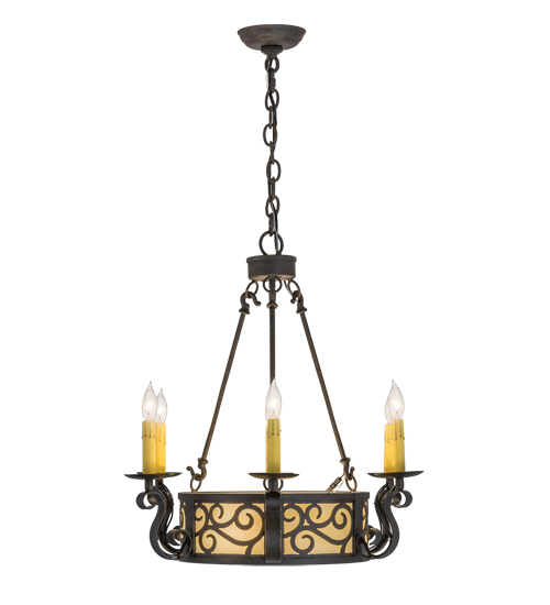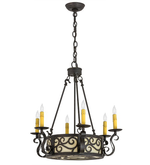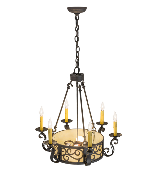 A touch of warm opulence is blended with elegant scroll-like styling, this chandelier offers a lovely transitional style. The fixture is handcrafted with Creme Carrare Idalight around the perimeter and on the bottom diffuser. The shade is complemented with hardware and accents featured in a Textured Chestnut finish. Sparkling illumination emanates from six faux candlelights perched on bobeches with scroll styled arms. Custom crafted by highly skilled artisans in our 180,000 square foot manufacturing facility in Yorkville, New York, this fixture is available in custom sizes, styles, colors and dimmable energy efficient lamping. The fixture is UL and cUL listed for damp and dry locations.