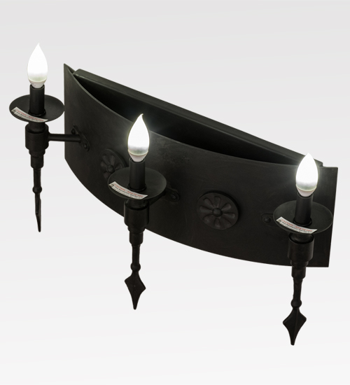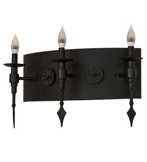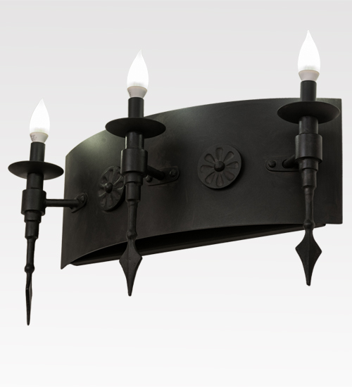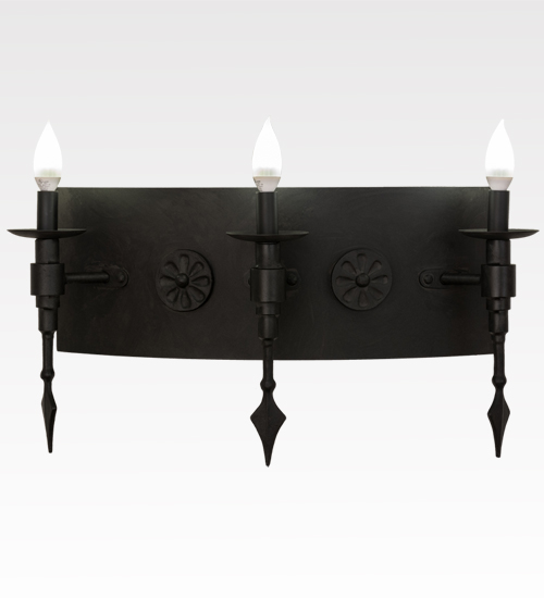 Welcome a handsome Gothic look into your home or business with the stunning Warwick wall sconce, which integrates a distinctive motif with classic styling. Three faux candles, perched atop bobeches embraced on a curved backplate, provide beautiful ambient lighting using customer-supplied 3-watt LED lamps which feature energy savings, reduced maintenance and long life. Decorated with cast iron medallions and spear tip accents in a Costello Black finish, Warwick completes an evocative impression. Handcrafted in our 180,000 square foot manufacturing facility in Yorkville, New York. Available in custom finishes, sizes and colors, as well as dimmable energy efficient lamping options. UL and cUL listed for damp and dry locations.