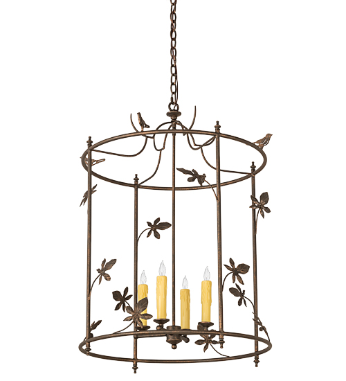 Inspired by the charming profile of caged homes for our feathered friends. This curvaceous cage-like pendant reveals 4 Ivory faux candlelights that evoke beautiful ambient illumination. Adorned with complementary bird and leaf accents, the frame and hardware are shown in a handsome Gilded Tobacco finish. Overall height ranges from 38 to 86 inches as the chain can be easily adjusted in the field. The Jillian Pendant is featured in our American made, American designed handcrafted Floral Lighting Collection. UL and cUL listed for dry and damp locations.