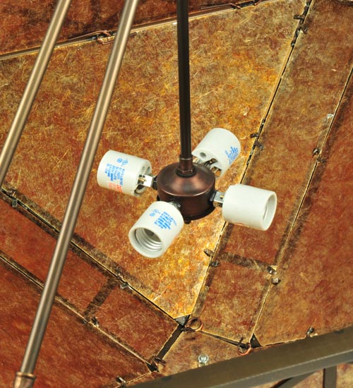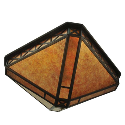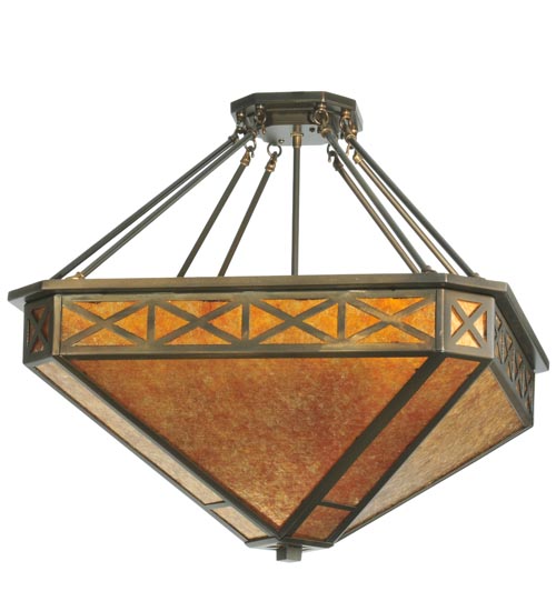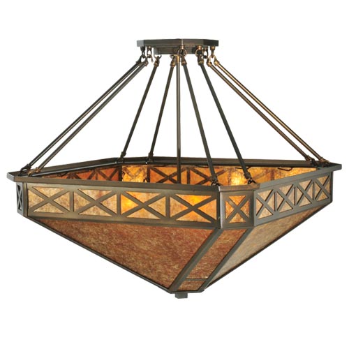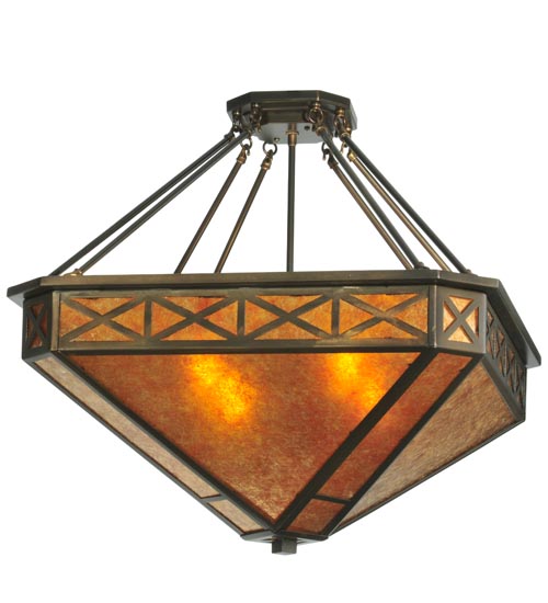 An Xtraordinary lighting design. This striking pendant features stunning Saltire stylized accents on an Amber Mica inverted shade. The pendant is complemented with a frame and hardware hand finished in an Antique Copper hue. This unique pendant will make an impressive centerpiece in any room. Domestically Produced in our 180,000 sq ft manufacturing facility in Yorkville, NY. Customize shade colors and styles, metal finishes and pendant sizes. UL and cUL listed for dry and damp locations.