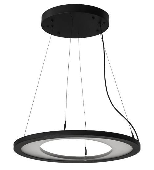 A modern sophisticated pendant featuring an extraordinary element of ambient light, a spectral halo creates a stunning visual effect and breathtaking drama. Supported by sturdy Spacecraft cables for balance and precision, this custom Solar Black finished solid metal ring reveals a Contrail Mist Idalight diffuser. High powered, Integral LEDs deliver dimmable, robust illumination, energy savings, minimal maintenance and long life. Custom sizes, styles and finishes are available, as well as other lamping options. This dramatic upscale pendant is UL and cUL listed for damp and dry locations.