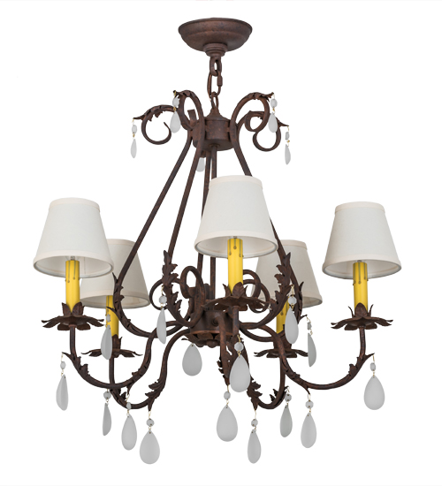 An elegant chandelier design comes to light with sparkle and glamor. Faux Amber candlelights are topped with Natural Linen Textrene tapered shades perched on fanciful floral bobeches, which are embraced by exquisite curved arms featured in a Rusty Nail finish. Matching Acanthus leaves, crystal droplets and scrolls grace this lovely fixture. Handcrafted by highly skilled artisans in our 180,000 square foot manufacturing facility in Yorkville, New York, this fixture is available in custom sizes, styles, colors and dimmable energy efficient lamping options. The chandelier is UL and cUL listed for dry and damp locations.