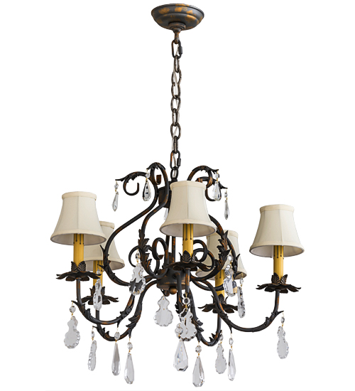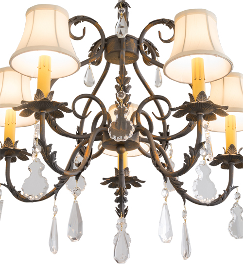 A splendid elegance is combined with refined sophistication. The Chantilly Chandelier impresses with Hand-forged Iron frame and floral bobeches that embrace Amber faux candlelights which are crowned with Cream Trumpet Textrene Shades for an upscale look. French Bronzed finished hardware with acanthus leaves and scrolled accents are trimmed with luxurious crystal pendalogues. Handmade in the USA, this chandelier is available in custom styles, colors and sizes, as well as dimmable lamping options. UL and cUL listed for dry and damp locations.