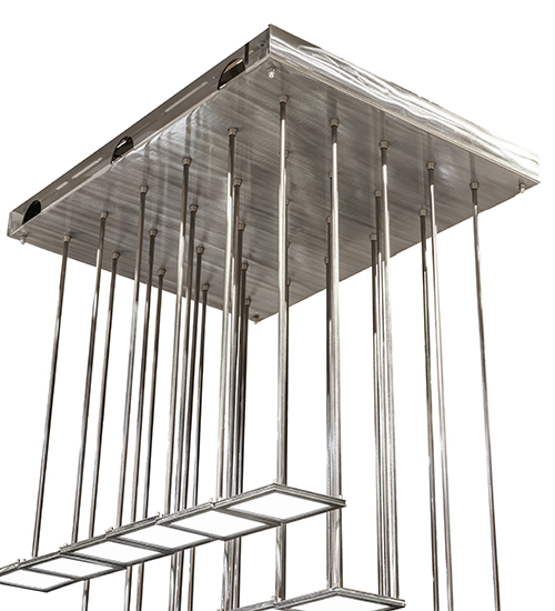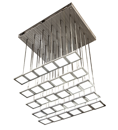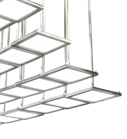 A massive modern chandelier using the latest Integral Organic Light Emitting Diode (OLED) nanotechnology. The dimmable Kossar luminaire is created with 30 unique Integral OLED ultra thin panels- all delivering energy efficient 4000K illumination without glare from a flat light source. The hardware, decorative accents and frame are featured in a stunning Alloy Wheel Clear Coat finish. This luminaire is combined with two fixtures: model 216326 27″ Long Kossar and model 216328 27″ Long Kossar to create model 214121 80″ Long Kossar. Custom crafted in our 180,000 square foot manufacturing facility in Yorkville, New York. OLED panels, metal finishes and fixture sizes can be customized. Contact us for additional sustainable OLED lighting solutions.additional sustainable OLED lighting solutions.