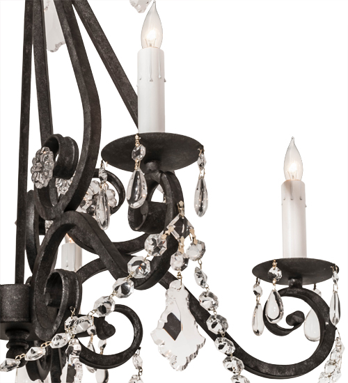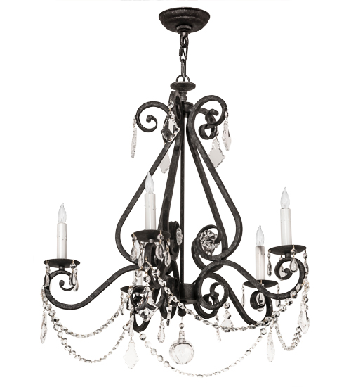 Offering a luxurious charm and elegance. Adrianna features an elaborate design with scrolled steel arms and accents in a stunning Smoke finish. The exquisite chandelier reveals 5 White faux candlelights perched on bobeches and adorned with crystal droplets, medallions and garland. Handcrafted in our 180,000 square foot manufacturing facility in Yorkville, New York. Metal finishes, designs and sizes can be customized to your needs. UL and cUL listed for dry and damp locations.
