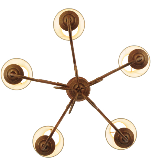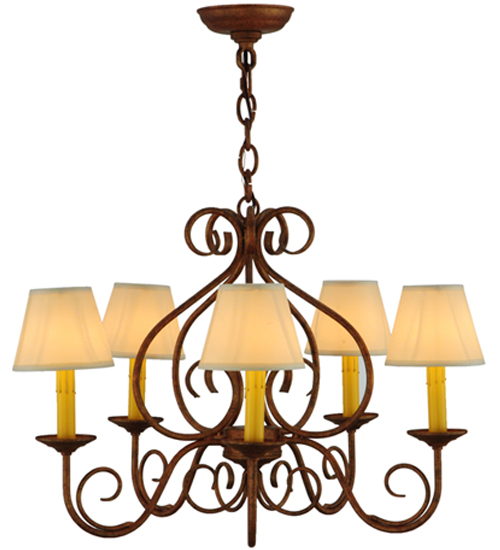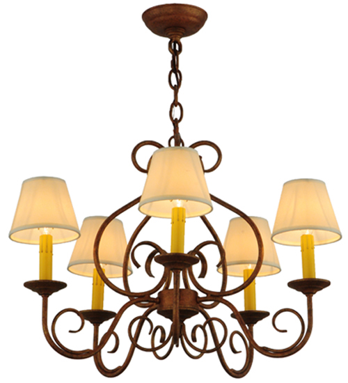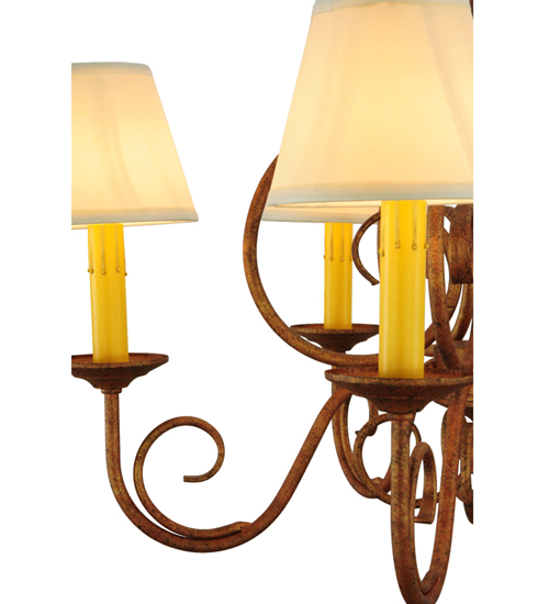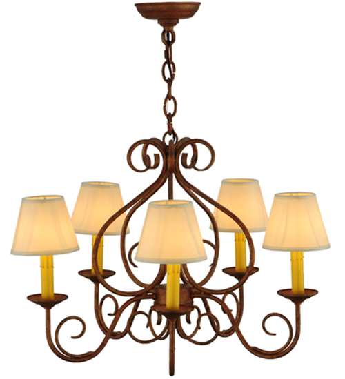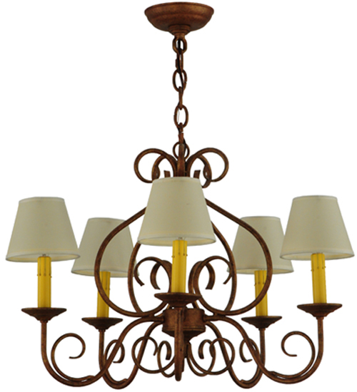 A sumptuous decorative design evokes a rich lustrous charm. Jenna features a stunning Autumn Leaf finish. The Hand-Forged Iron Scrollwork and bobeches embrace 5 Amber faux candlelights topped with Natural Textrene shades. The overall height ranges from 21 to 56 inches as the chain length can be easily adjusted in the field to accommodate your specific lighting application needs. Handcrafted in our 180,000 square foot manufacturing facility in Yorkville, New York. Shade colors, metal finishes and fixture sizes can be customized to your needs. UL and cUL listed for dry and damp locations however we do not recommend installing it in spaces that experience a large amount of moisture due to the fabric shades.