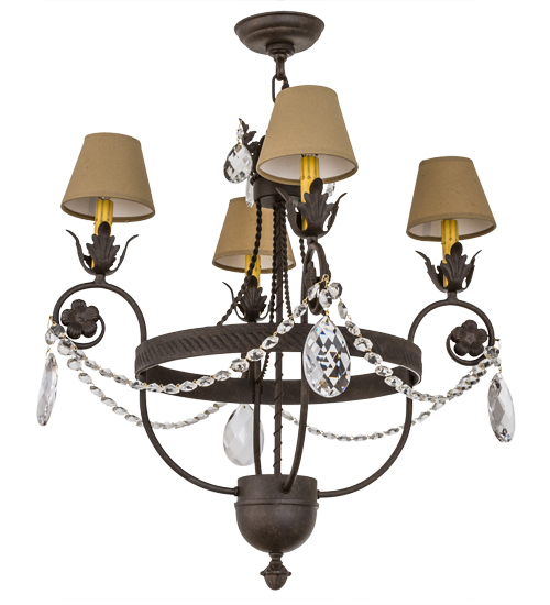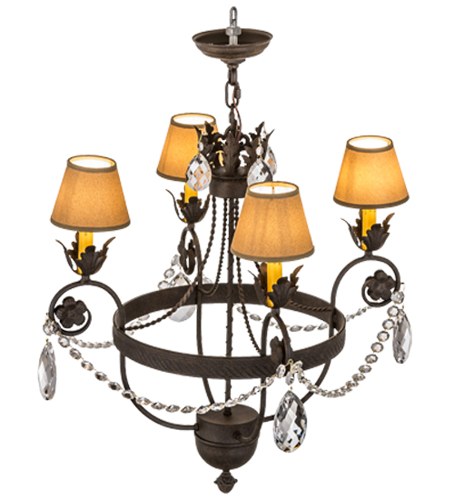 Exquisite styling and luxurious charm are reflected in these faceted crystal charms, scroll arms, Acanthus leaves and rich Chestnut finished hardware like a fine wooden paneled library. This elegant chandelier embraces four Amber faux candlelights topped with Tuscan Alabaster Textrene shades. This chandelier features quality materials and hand detailed American craftsmanship perfected by years of time honored artistry, passed down from generations of prolific artisans. Custom sizes, styles, colors and dimmable energy efficient lamping options are available. The fixture is UL and cUL listed for damp and dry locations.
