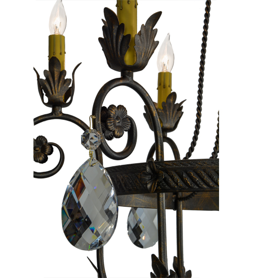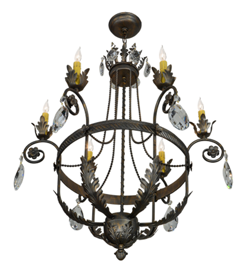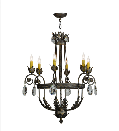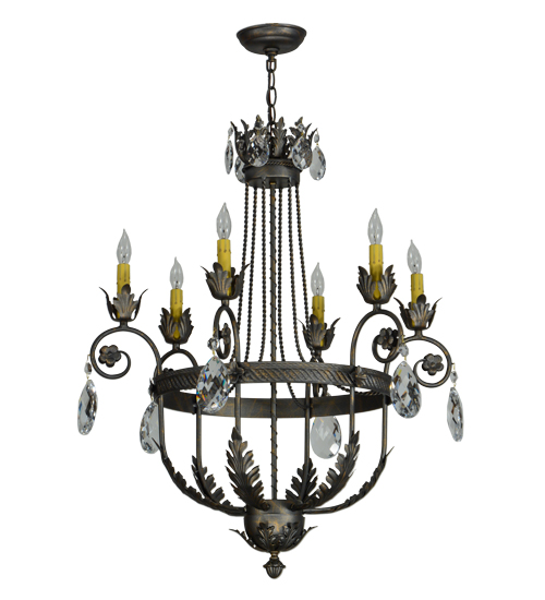 Exquisite styling and luxurious charm are reflected in the Antonia Chandelier, which is adorned with 6 Amber faux candlelights perched on floral bobeches with scrolled arms. The lush decorative accents, including Acanthus leaves, frame and Hand-forged Iron hardware are featured in a French Bronze finish and enhanced with Crystal droplet accents. The fixture features quality materials and hand detailed American craftsmanship perfected by years of time honored artistry, passed down from generations of highly skilled artisans. Custom sizes, styles, colors and dimmable energy efficient lamping options such as LED are available. The fixture is UL and cUL listed for damp and dry locations.