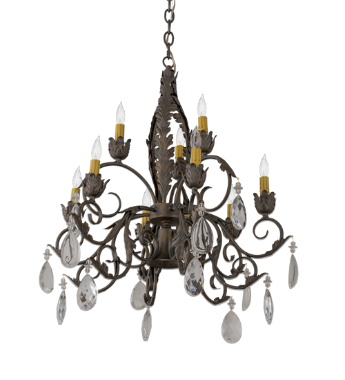 A luxurious elegance and romantic charm are captured by this Country French inspired Chandelier design. 10 Amber faux candlelights topped with Cream Textrene shades are embraced by floral bobeches with the curved arms of this decorative frame. The frame, scrollwork and hardware are detailed with bold scrolls and intricately carved acanthus leaves hand finished in a French Bronze hue. Large Crystal Pendalogs also accent this lovely chandelier. Custom colors, styles and sizes are available, as well dimmable energy efficient lamping options such as LED. The 26-inch wide fixture is UL and cUL listed for damp and dry locations.