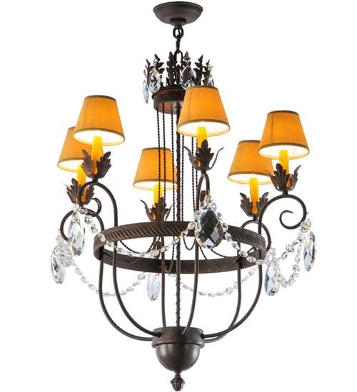 An exquisite chandelier design comes to light with illuminating allure and charm. Six Amber faux candlelights topped with Parchment shades are perched on floral bobeches, which are embraced by gracefully curved arms with Hand-forged Iron Hardware featured in a Cajun Spice finish. The fixture is enhanced with faceted crystal charms, scroll and Acanthus leaf accents. Handcrafted in our facility in Yorkville, New York, this fixture is available in custom sizes, styles, colors and dimmable energy efficient lamping options such as LED. The chandelier is UL and cUL listed for dry and damp locations.