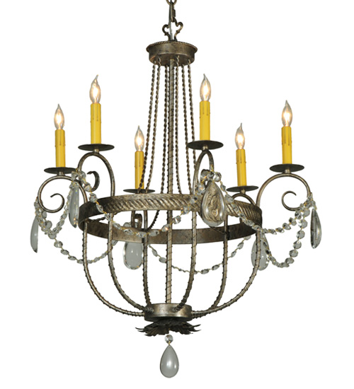 Exquisite styling and luxurious charm are reflected in this 6-light chandelier. This fixture combines faceted crystal charms, textured scroll arms, an Acanthus leaf accent and rich Corinth finished hand-forged hardware. This elegant chandelier embraces 6 Amber faux candlelights. This chandelier features quality materials and hand detailed American craftsmanship perfected by years of time honored artistry, passed down from generations of highly skilled artisans. Custom sizes, styles, colors and dimmable energy efficient lamping options such as LED are available. The fixture is UL and cUL listed for damp and dry locations.