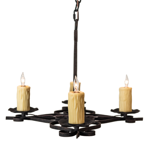 Enjoy the rich, classic styling and distinctive look of Elianna. Four Ivory faux candlelights perched atop custom-tailored bobeches are connected with an elaborate frame featuring interlocking scroll designs and slender leaf accents for aesthetic appeal. Crowned with a stylized clover silhouette, the chandelier offers decorative accents, frame, and hardware in a stunning Distressed Chestnut finish. These shining, eye-catching rings emit a clean glow and enhance the ambiance of the surrounding space as they elevate the fixture’s appeal in homes and hotels from Concord, New Hampshire, to Lincoln, Nebraska. The Elianna 4 Light Chandelier is featured in our American-made, American-designed, handcrafted Traditional Lighting Collection, which is manufactured in the USA. UL & cUL listed for dry and damp locations.