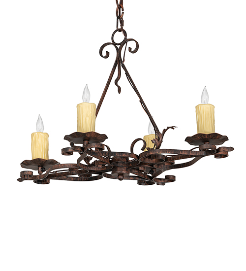 Enjoy the rich, classic styling and distinctive, sophisticated look of Elianna. Four Ivory faux candlelights perched atop custom-tailored bobeches are connected with an elaborate oblong frame featuring interlocking Hand-Forged scroll designs for exquisite aesthetic appeal. The decorative accents, frame, and hardware are offered in a stunning Cimarron finish. The overall height ranges from 22 to 58 inches, as the chain length can be easily adjusted in the field to accommodate your specific lighting application needs. The Elianna 4 Light Oblong Chandelier is included in our American-manufactured, American-designed, handmade Transitional Lighting Collection. UL & cUL listed for dry and damp locations.