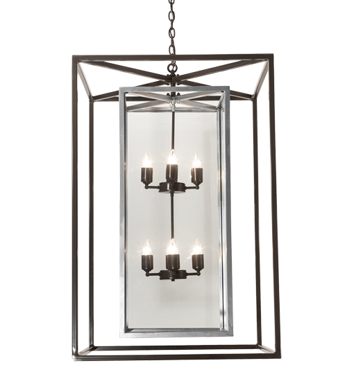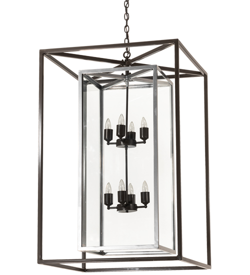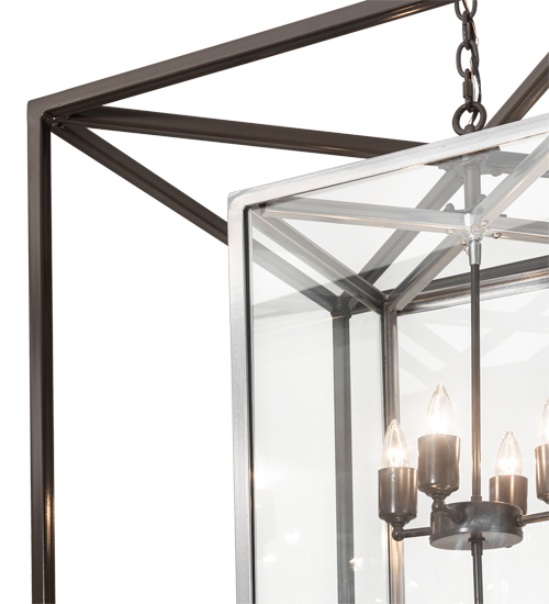 A sophisticated architecturally styled fixture is designed with a pizazz that is unique, fresh and stylish. Give your decor an extra edge with this breathtaking fixture. Kitzi Box is highlighted with a solid structure that surrounds a Clear Glass Lens revealing 8 complementary faux candlelights. The outer frame is featured in a Timeless Bronze finish while the inner frame displays an Extreme Chrome finish. The overall height ranges from 48 to 72 inches as the chain length can be easily adjusted in the field to accommodate your specific application needs. Custom crafted in our 180,000 square foot manufacturing facility in Yorkville, New York. Special sizes, finishes and diffuser colors available. UL and cUL listed for dry and damp locations.