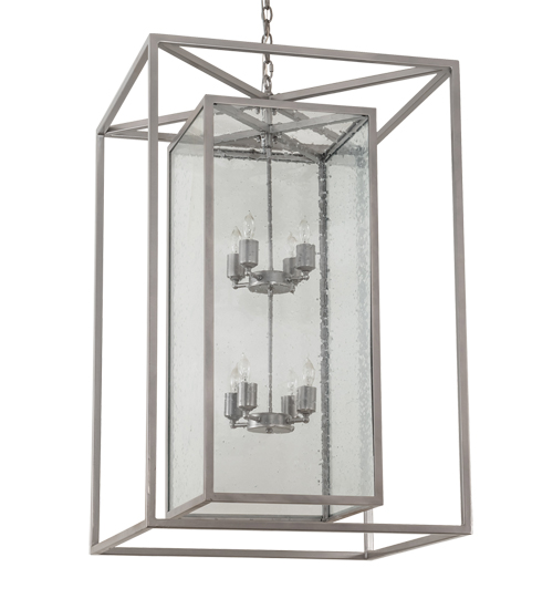 A sophisticated architecturally styled fixture is designed with a pizazz that is fresh and stylish for today’s interiors and exteriors. Give your decor an extra edge with this breathtaking fixture, which is highlighted with a solid structure. Clear Seeded Glass panels feature beautiful ambient illumination projecting from 8 Complementary faux candle lights. The fixture is featured in a Nickel powder coat special treated to endure the outdoor environment. Overall height ranges from 47 to 202 inches as chain length adjusts easily in the field. Handmade in our 180,000 square foot manufacturing facility in Yorkville, New York. Lens materials and metal finishes can be customized to your requirements. UL & cUL listed for dry and damp locations.