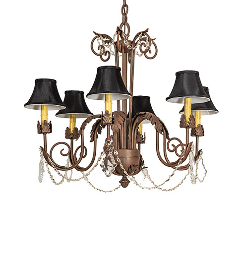 Luxurious elegance comes to light. This stunning chandelier features a gorgeous Cortez Gold finished profile adorned with six Ivory faux candlelights embraced by floral fitters, crowned with Black Textrene shades, and accented with large crystals and crystal garland. The fixture projects beautiful ambient illumination and has an overall height ranging from 29 to 76 inches, as the chain length can be easily adjusted in the field. The lighting design was inspired by homes and other structures throughout the USA, including Belmont, Massachusetts, to Albuquerque, New Mexico, to Palo Alto, California. The Lindsay 6 Light Chandelier is featured in our American-made, American-designed, handmade Transitional Collection. UL & cUL listed for dry and damp locations; however, we do not recommend installing it in spaces that experience a large amount of moisture due to the fabric shades.