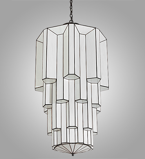 Designed with the glitz and glam of old fashioned movie theaters, Paramount evokes a romantic allusion with a dramatic lighting design that features White art glass created using famous copperfoil construction. Multi layers and levels of enclosed glass towers create an extraordinary dimensional effect. A three step hub, featured in a Craftsman Brown finish, crowns this shade. Three energy efficient, customer-supplied 12w LED lamps deliver energy savings, reduced maintenance and long life. Handcrafted in the USA, this fixture is offered in custom sizes, styles and colors. UL and cUL listed for damp and dry locations.