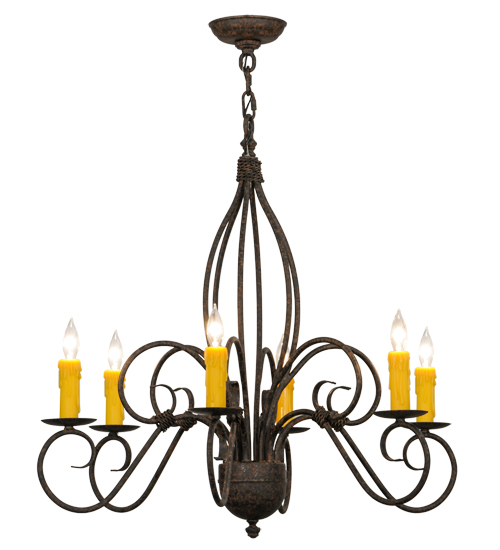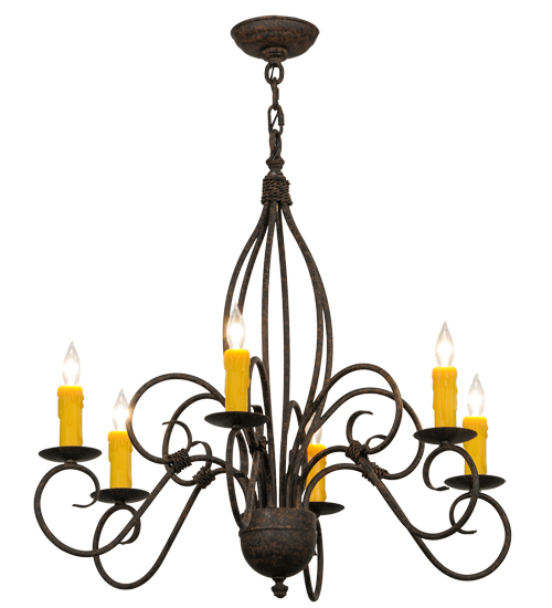 Squire features an elegant European design that employs Hand-Forge Iron scrolled arms and contoured supports that define its graceful profile. 6 Ivory faux candlelights perched on saucer-like bobeches add a lovely touch to this fixture. The chandelier is featured in a Coffee Bean hand applied finish. The overall height of this pendant ranges from 32 to 67 inches as the chain length can be easily adjusted in the field to accommodate your specific lighting application needs. Handmade in our 180,000 square foot manufacturing facility in Yorkville, New York. Available in custom sizes, styles and finishes. UL and cUL listed for dry and damp locations.