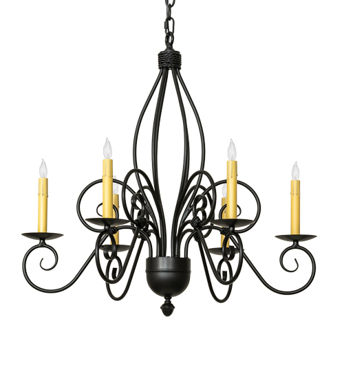 Elegant, classic European chandeliers inspired Squire’s silhouette, employing Hand-Forged Iron scrolled arms and contoured supports to define its graceful profile from top to bottom and arm to arm. 6 Ivory faux candlelights perched on saucer-like bobeches add a lovely touch to this fixture, hand-finished in Blackwash. Overall height ranges from 32 to 67 as the chain easily adjusts in the field. The Squire Chandelier is featured in our American-manufactured, American-designed, handmade Traditional Lighting Collection. Manufactured in Yorkville, NY. UL & cUL listed for dry and damp locations.