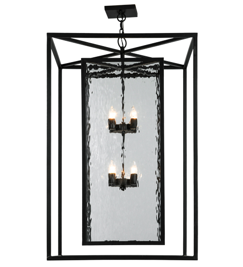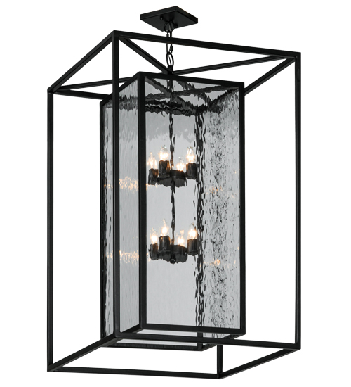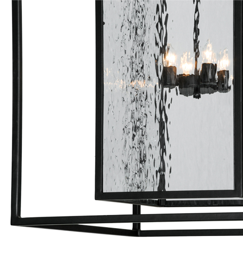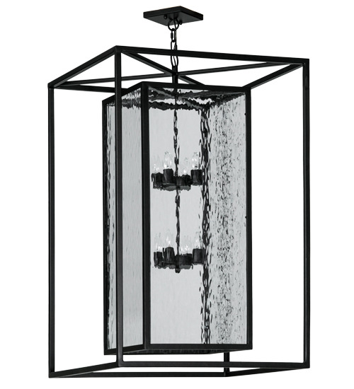 A sophisticated architecturally styled fixture is designed with a pizazz that is unique, fresh and stylish. Give your decor an extra edge with this breathtaking pendant, which is highlighted with a solid metal structure that surrounds a Clear Water Glass Lens. The sturdy hardware and frame are featured in a handsome Solar Black finish. Handcrafted in the USA, Kitzi is available in custom sizes, styles and finishes, as well as dimmable energy efficient lamping options. The 28-inch square fixture is UL and CUL listed for dry and wet locations.