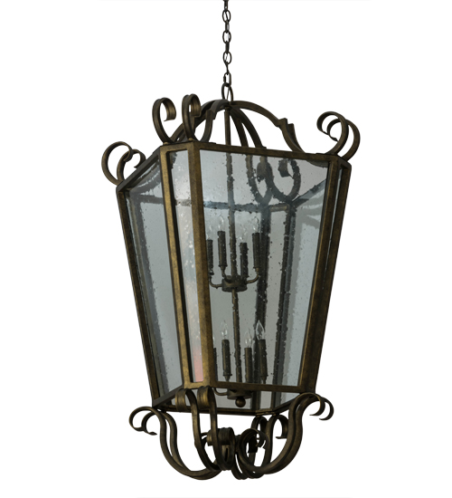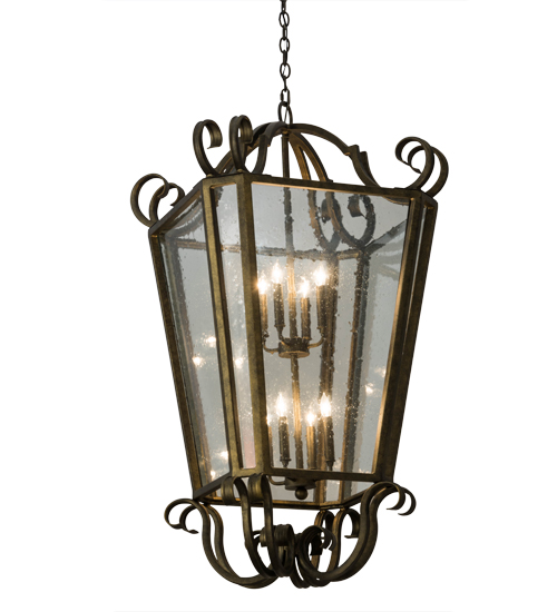 Classic elegance combined with a rich distinctive look comes to life with a stunning lantern design that will entice anyone, from the lighting novice to the experienced connoisseur. This exquisite Clear Seeded Glass pendant, designed with two 4-light faux candelabras, is enhanced with a frame, scrolled accents and hardware featured in an Antique finish. Custom crafted by highly skilled artisans in our 180,000 square foot manufacturing facility in Yorkville, New York. Custom colors, styles and sizes are available, as well as dimmable energy efficient lamping options such as LED. UL and cUL listed for damp and dry locations.
