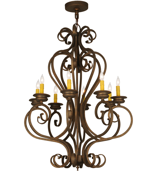 Beauty and grace come to light with this elegant chandelier highlighted with an elaborate scroll design. 8 Amber faux candlelights are perched on distinctive bobeches featured in a tasteful French Bronze finish. Perfect to illuminate nearly any room in fine homes, hotels, restaurants and other residential and commercial spaces. This classic decorative lighting fixture complements any interior design. Handcrafted in our manufacturing facilities in the USA, Fernando is available in a variety of custom sizes, finishes and dimmable energy efficient lamping options such as LED. The 28-inch wide chandelier is UL and cUL listed for damp and dry locations.