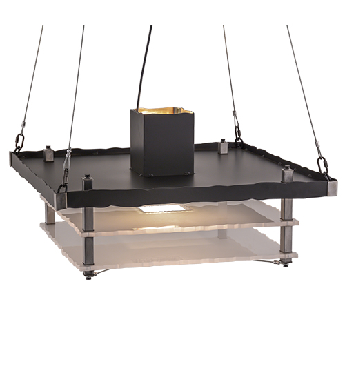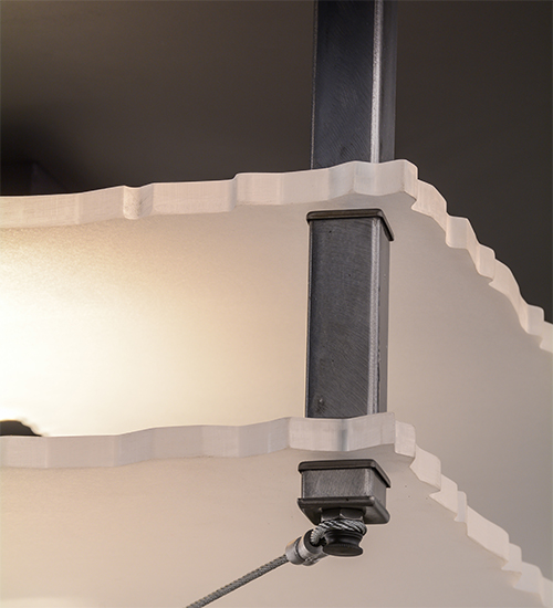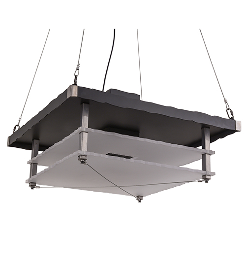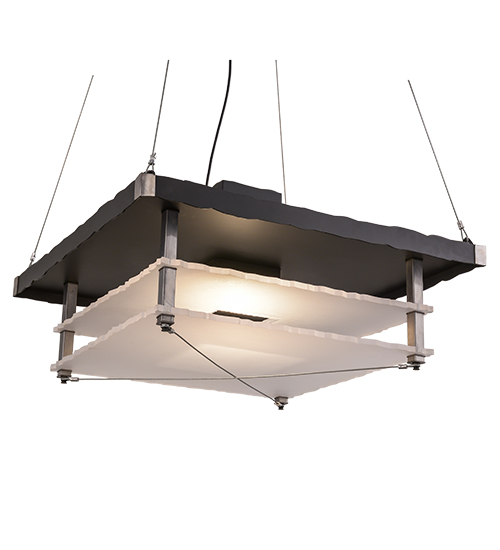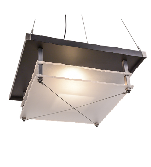 Energized by inventions that advocate reason, capitalism and individualism, Metropolis takes a contemporary approach to an industrial design. This pendant deploys thick layers of Contrail Mist Idalight, connected with hardware that is featured in a Black Deco/Raw Steel finish. Wire suspensions provide additional support and a decorative touch. The fixture is custom crafted in the USA. Custom colors, styles, sizes and dimmable energy efficient lamping options such as LED are available. The pendant is UL and cUL listed for dry and damp locations.