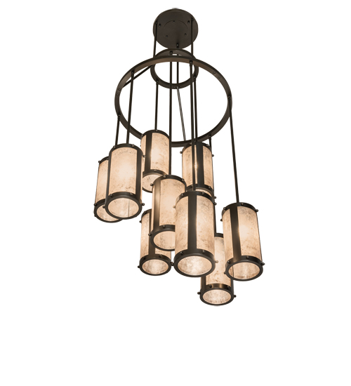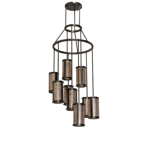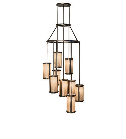 Spanning over 6 feet in height, this stunning Cartier chandelier features an eye-catching transitional look. Handsome Silver Mica shades are aligned in a staggered formation, suspended from 2 decorative rings and a canopy while providing light at various levels. All hardware is hand-finished in Exterior Oil Rubbed Bronze, while an inviting glow evokes from nine decorative cylinders. Ideal for illuminating entryways, lobbies, foyers, ballrooms, and other residential, hospitality, and commercial spaces. The Cartier Cascading Chandelier is offered in our American-made, American-designed, handcrafted Transitional Lighting Collection. Manufactured in Yorkville, NY. UL and cUL listed for dry and damp locations.