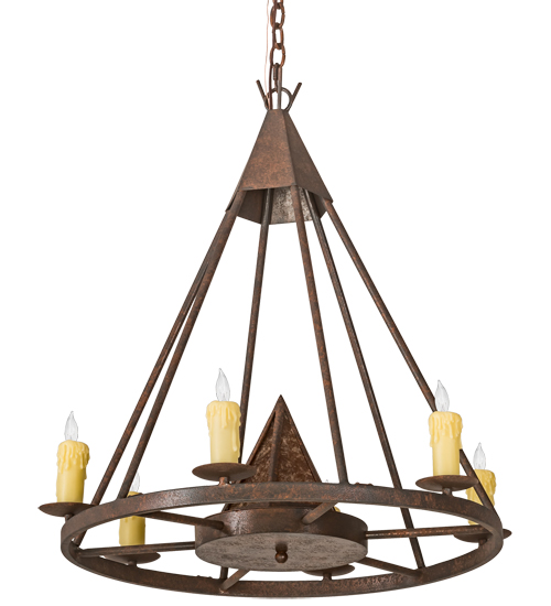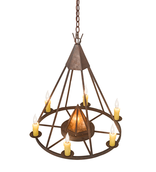 7 Ivory faux candlelights line the perimeter of this chandelier, surrounding an Amber Mica arrow shaped diffuser in the center of the ring as the overall frame mimics the same arrowhead, teepee-like motif. Each faux candlelight is perched on bobeches which are hand finished in a Rusty Nail hue to match the frame and hardware. Handmade in Yorkville, NY, this chandelier is available in custom sizes, designs and colors. Dimmable energy efficient lamping such as LED are offered. The 28-inch wide chandelier is UL and cUL listed for dry and damp locations.