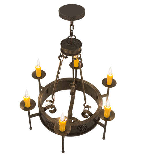 Lorenzo integrates a rich charm and artistic look. Floral medallions accentuate this stunning steel chandelier, which is adorned with six exquisite faux candlelights perched on bobeches with long ballpoint arms. The fixture is enhanced with sturdy, detailed hardware and a scrolled finial featured in a handsome Golden Bronze finish. The fixture is ideal for entryways, dining areas, and other rooms in a variety of residential and commercial settings. The chandelier is handcrafted by our artisans in the USA. Options include dimmable energy efficient lamping, as well as custom sizes, styles and colors. The fixture is UL and cUL listed for damp and dry locations.