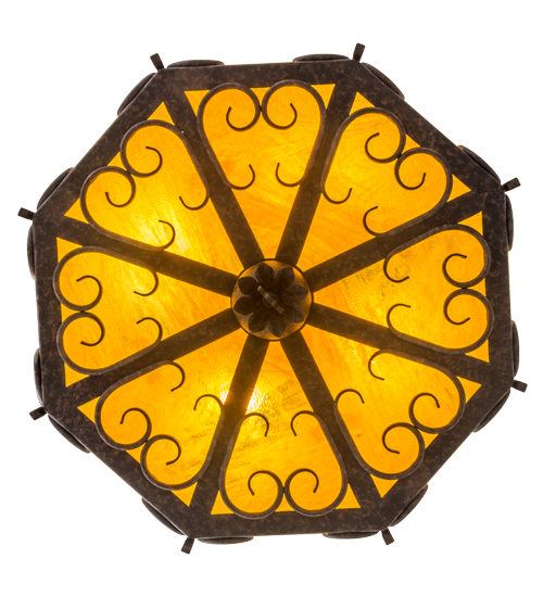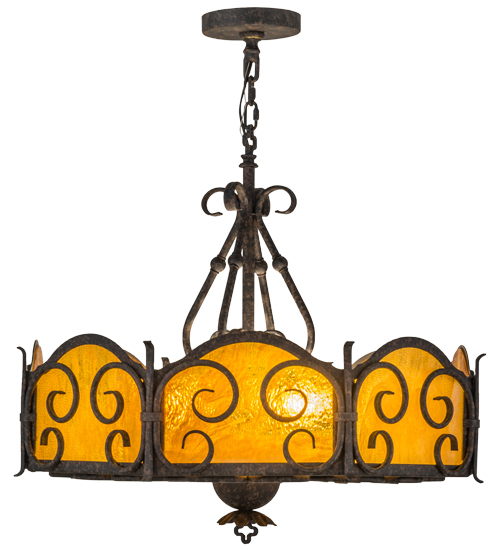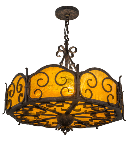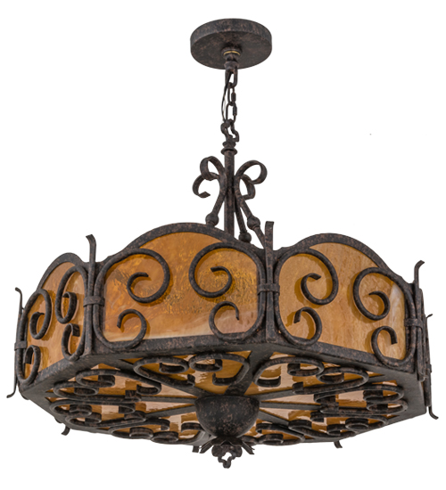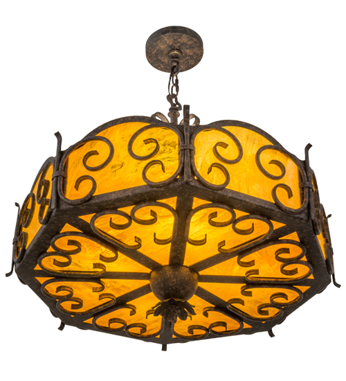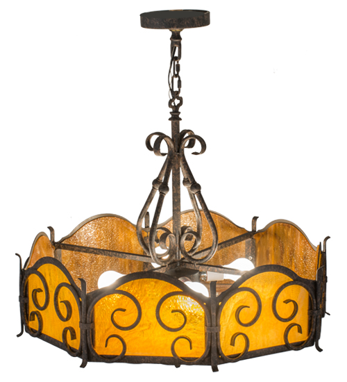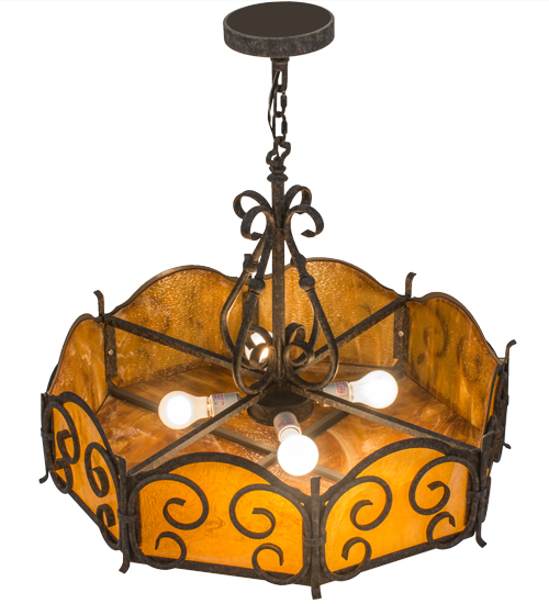 Dramatic elegant scroll designs are highlighted on six side panels and the bottom diffuser of this beautiful pendant, which is featured in stunning Honey art glass with a granite texture. The scrolls, decorative accents and matching hardware are all featured in an exquisite Chestnut Textured finish. Handcrafted in the USA, this pendant is available in custom sizes, styles and colors, as well as dimmable energy efficient lamping options. This fixture is UL and cUL listed for dry and damp locations.