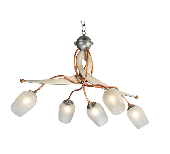 A transitionally styled chandelier, Ballerina sautes in the air with distinctive grace and elegance, appearing to balance on your ceiling stage with a design ranging from modern to classic. The winding ballpoint tipped frame is featured in a Brushed Steel finish and entwined with bending Copper limbs that embrace five Clear Mouthblown Glass shades with a Satin finish. Handmade by highly skilled artisans at our manufacturing facility in Yorkville, New York this chandelier is available in custom sizes, styles and colors, as well as dimmable energy efficient lamping options such as LED. The 30-inch long fixture is UL and cUL listed for damp and dry locations.