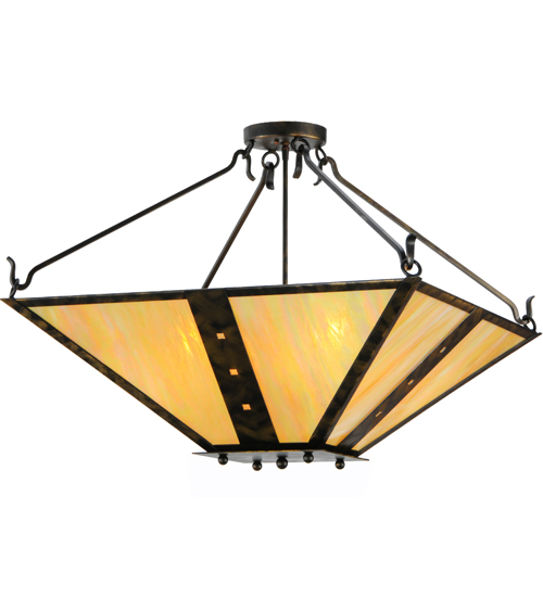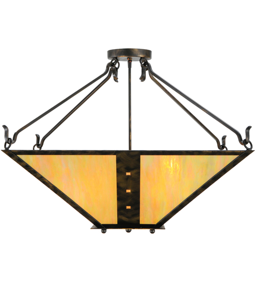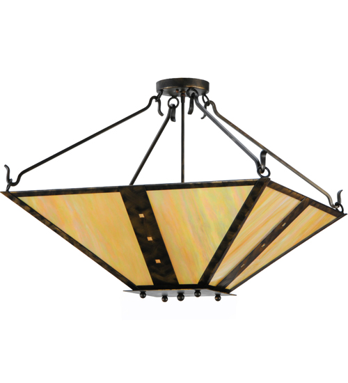 Inspired by the Arts & Crafts design movement, Zandra is designed with an inverted Mission styled Beige Iridescent art glass diffuser that is complemented with a frame and hardware featured in an Antique Black finish. The shade is accented with miniature square geometric designs in the central bands and five decorative studs on the finial. This fixture is custom crafted at the manufacturing facility in Upstate New York, in the USA. Custom colors, sizes and styles are available, as well as dimmable energy-efficient lamping options. The fixture is UL and cUL listed.