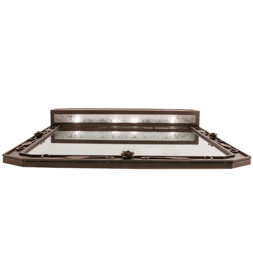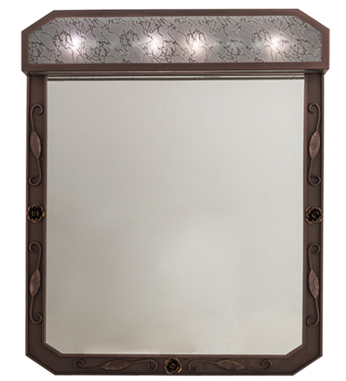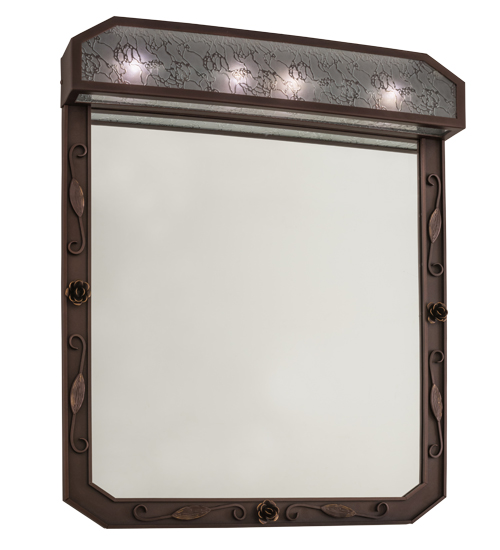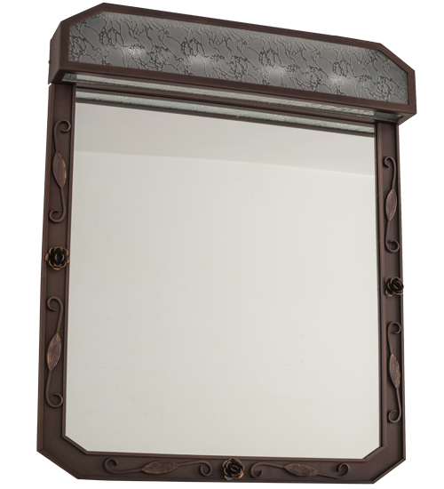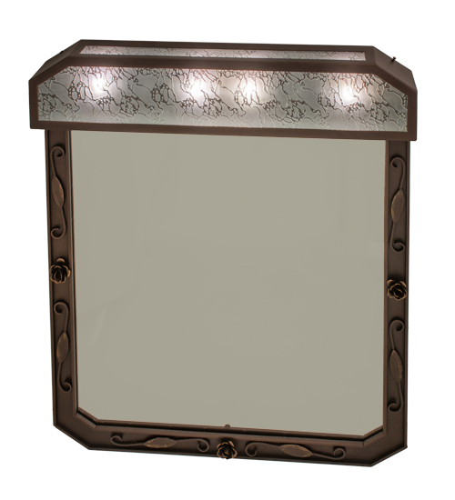 Decorative accents and rose medallions accentuate this custom steel vanity fixture, which features a stunning Bakial glass diffuser. This luminous mirror is enhanced with a handsome frame in a Mahogany Bronze finish with Gold highlights. The fixture is ideal for fine baths in residential, hospitality and commercial settings. Custom crafted in our 180,000 square foot manufacturing facility in Yorkville, New York. Custom colors, styles and sizes are available, as well as dimmable energy efficient lamping options such as LED. UL and cUL listed for damp and dry locations.