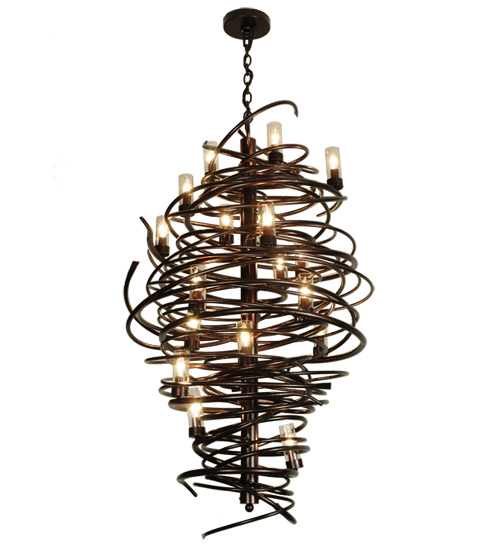 The bold, eye-catching Cyclone simulates whirling winds of energy and gyration with twisting steel that is accentuated with 18 delicately placed beacons to help you weather the storm. The winding mass of steel surrounds a sturdy post, all featured in a Copper Vein finish. Make an impressive design statement that will wow guests in lobbies, conference rooms, entryways and other residential and commercial spaces. The fixture is handcrafted by master artisans in our Upstate New York manufacturing facility. Custom designs, styles, sizes and dimmable energy efficient lamping such as LEDs are available. This 30-inch wide chandelier is UL and cUL listed for damp and dry locations.