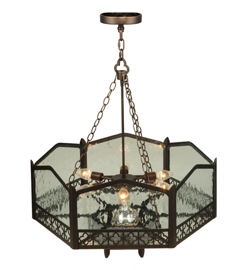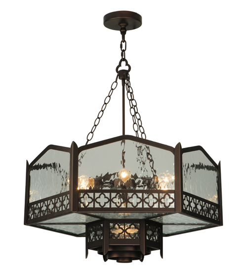 Offering a dramatic inspirational profile and elaborate design. The Church pendant evokes a heavenly glow from Clear Water Glass featured in a hexagonal cylindrical-styled frame that intersects a crown-shaped hexagonal shade. The fixture is accented with a Saltire patterned border offered in a Mahogany Bronze finish that matches the look of the handsome hardware. The overall height ranges from 35 to 65 inches and the chain length can be easily adjusted in the field to accommodate your specific lighting application needs. Custom crafted by highly skilled artisans in our 180,000 square foot manufacturing facility in Yorkville, New York. Special sizes, finishes and diffuser colors available. UL and cUL listed for dry and damp locations.