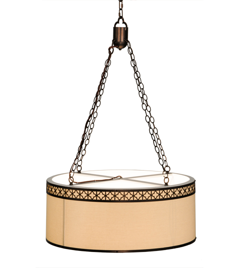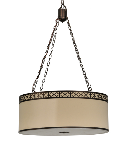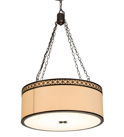 Designed with a stunning, round profile that fits into fine homes, hotels and other commercial and hospitality locations, this pendant defines a distinctive sophisticated aesthetic. The Beige Textrene shade is complemented with Quatrefoil accents and hardware featured in a Mahogany Bronze finish and enhanced with a Statuario Idalight bottom diffuser. Handcrafted in the USA, this fixture is available in custom colors, styles and sizes, as well as dimmable energy efficient lamping options such as LED. The pendant is UL and cUL listed for damp and dry locations.