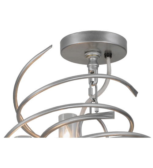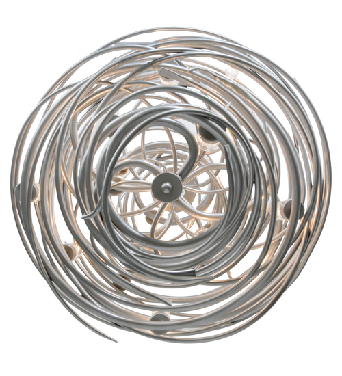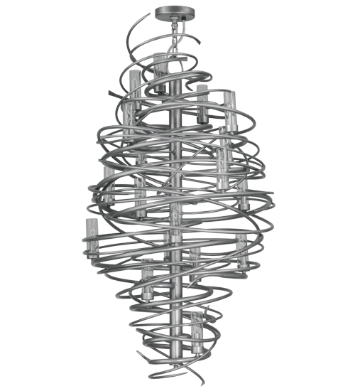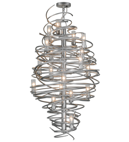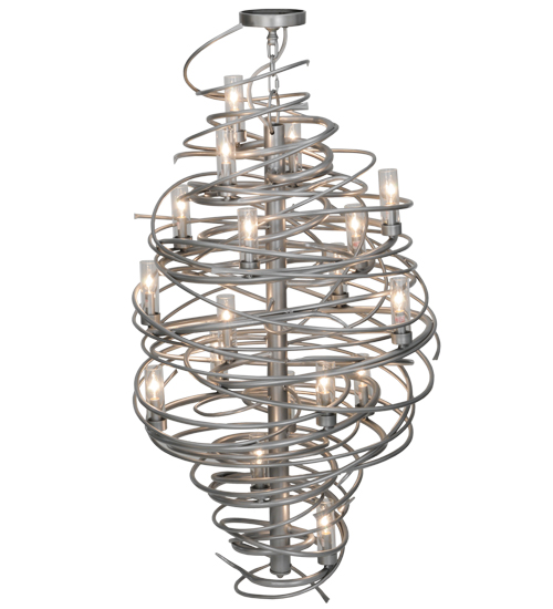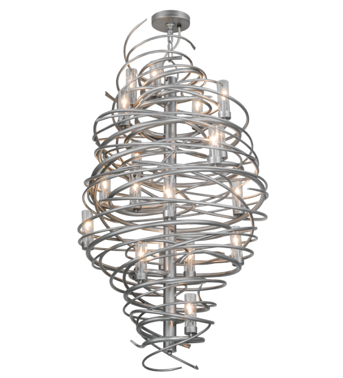 The bold, eye-catching Cyclone simulates whirling winds of energy and gyration with twisting steel that is accentuated with 18 delicately placed beacons to help you weather the storm. The winding mass of steel surrounds a sturdy post, all featured in our Pewter finish. Make an impressive design statement that will wow guests in lobbies, conference rooms, entryways and other residential and commercial spaces. The fixture is handcrafted by master artisans in our Upstate New York manufacturing facility. Custom designs, styles, sizes and dimmable energy efficient lamping such as LEDs are available. This chandelier is UL and cUL listed for damp and dry locations.