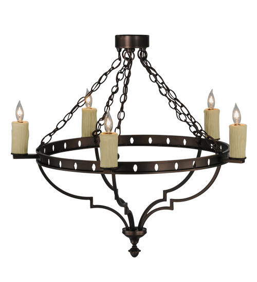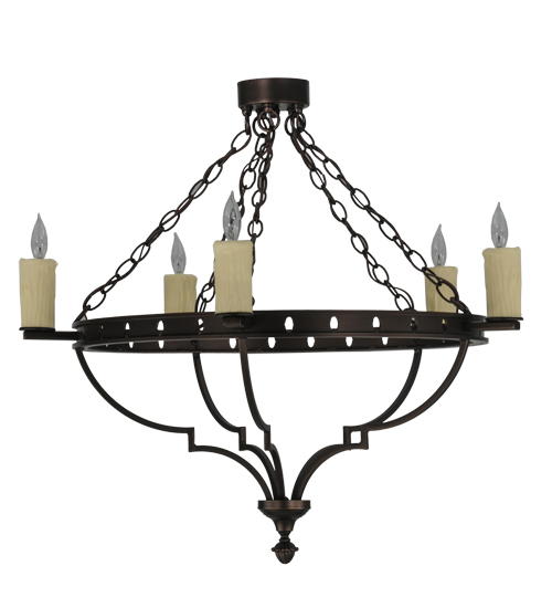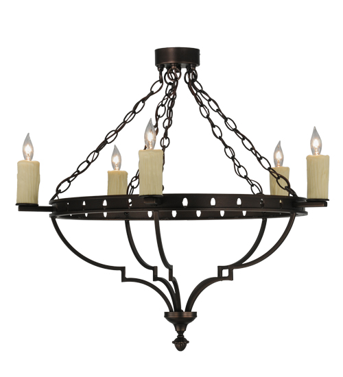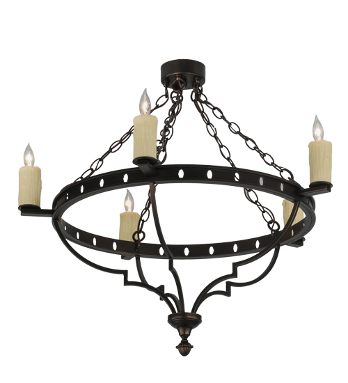 An elegant statement piece of distinction. The Botticini Chandelier features 5 Ivory faux candlelights aligned around the pierced ring which is hand finished in Mahogany Bronze. Ideal for illuminating entryways, dining areas and other rooms in fine residential and hospitality settings. Handcrafted by master artisans in our 180,000 square foot manufacturing facility in Yorkville, New York. Fixture designs, metal finishes and sizes can be customized to meet your needs. UL and cUL listed for dry and damp locations.