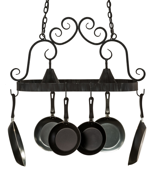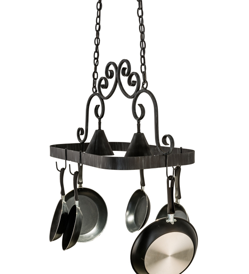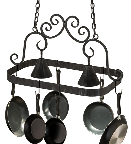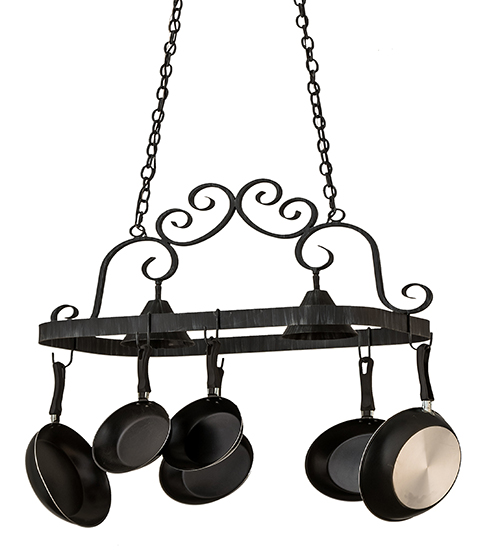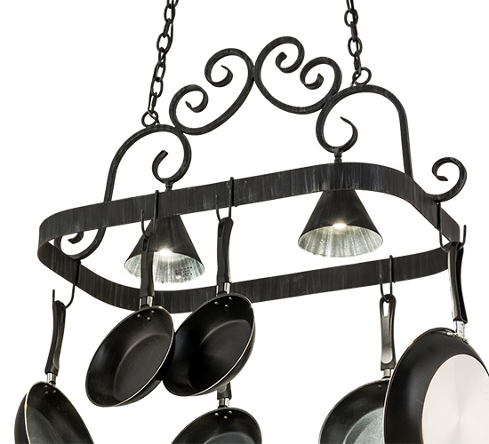 An upscale design that integrates form and function, Elana is highlighted with large scroll accents and an Antique Iron Gate finished frame with hooks to display fine cookware for easy access in kitchens. Two luminaires provide optimal downlighting to illuminate counter surfaces, tabletops, islands and architectural accents. Handcrafted in the USA by our highly skilled artisans, this fixture is available in custom sizes, styles, colors and energy-efficient lamping options. UL and cUL listed for damp and dry locations. (Cookware not included)