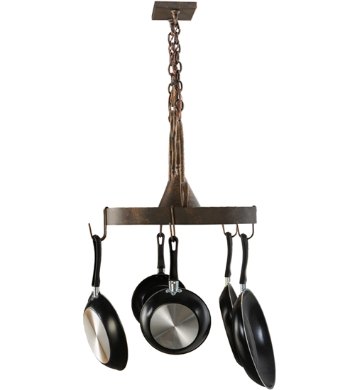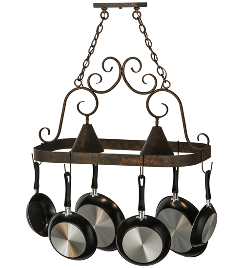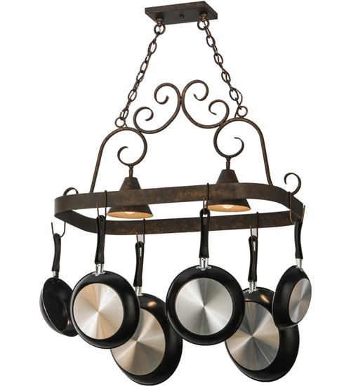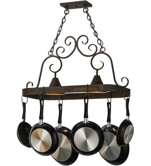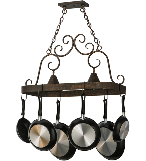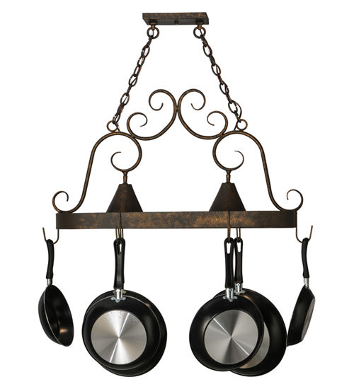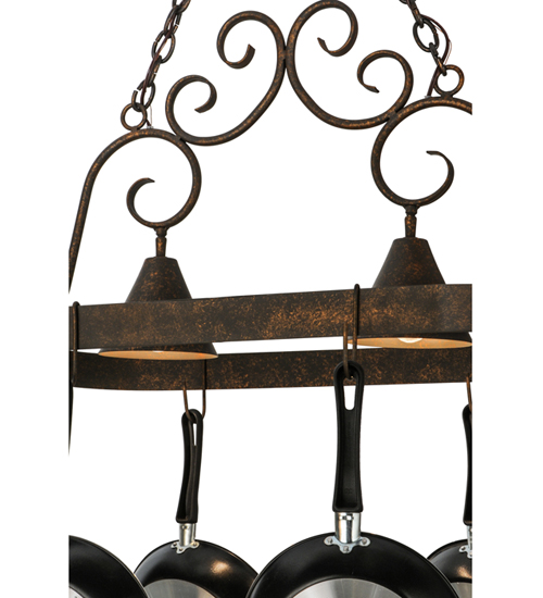 An upscale design that integrates form and function, the Elana 2 Light Pot Rack is highlighted with large scroll accents and a Gilded Tobacco finished frame with hooks to display fine cookware for easy access in kitchens. Two luminaires provide optimal downlighting to illuminate counter surfaces, tabletops, islands and architectural accents. Handcrafted in the USA by our highly skilled artisans, this Hand-forged Iron fixture is available in custom sizes, styles, colors and energy-efficient lamping options such as LED. The fixture is UL and cUL listed for damp and dry locations. (Cookware not included)