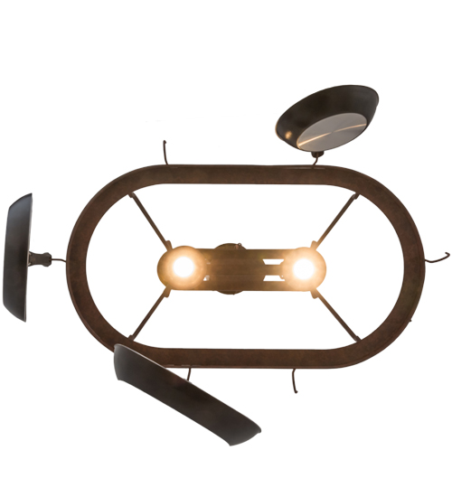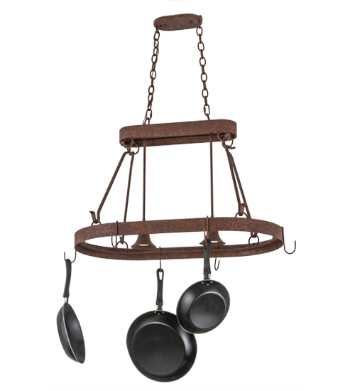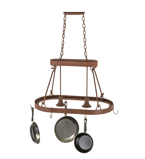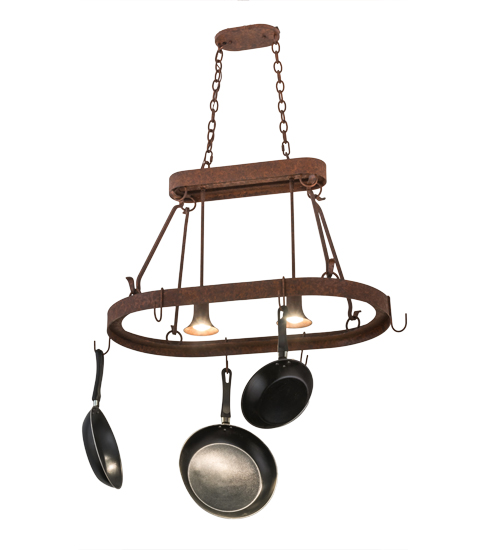 Rustic charm marries functional elegance with the Harmony Lighted Pot Rack. Rusty Nail finished scrollwork; frame and hardware are enhanced with hooks to display fine cookware and accessories. Two Customer supplied, Medium base downlights deliver functional illumination over kitchen islands and other surfaces. Custom crafted in Yorkville, NY, Harmony is available in custom designs, sizes, finishes and dimmable energy efficient lamping such as LED. The 32-inch long pendant is UL and cUL listed for dry and damp locations. (Cookware not included)