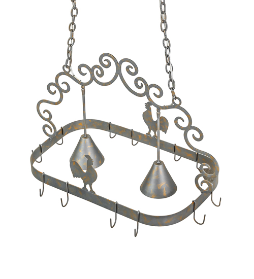Two charming rooster silhouettes are depicted on the frame of this pot rack fixture, enhanced with two medium-based downlights for functional illumination on islands, counters, tables, and other surfaces. The scrollwork and hardware are finished in a stunning French Bronze. This fixture is handcrafted by highly skilled artisans in the USA. Hooks are available to suspend fine cookware and accessories in your culinary space. The overall height ranges from 29 to 93 inches, as the chain can be easily adjusted on location. The Poulet 2 Light Pot Rack is part of our American-made, American-designed, handcrafted Lighted Pot Rack Collection, manufactured in Yorkville, New York. The fixture is UL and cUL listed for dry and damp locations.