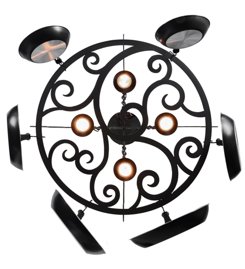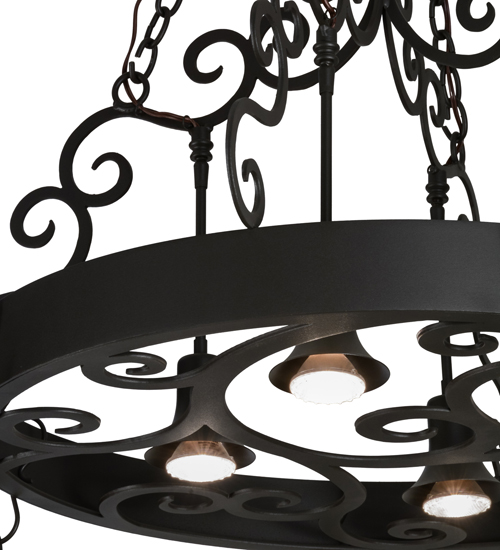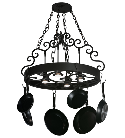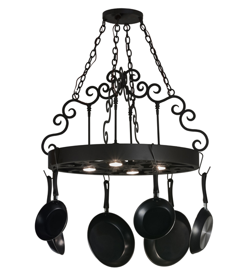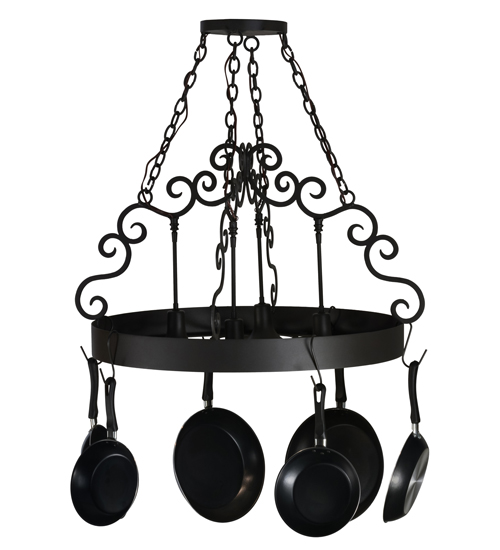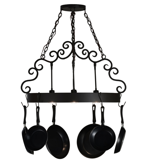 An upscale transitional lighting design that combines form with function, the Dior Lighted Pot Rack features large scroll accents and 4 Customer Supplied Medium base downlights that provide beautiful ambient illumination. The Round styled frame featured in a Wrought Iron finish is complemented with hooks to display fine cookware and accessories for easy access in kitchens. Handcrafted in the USA by our highly skilled artisans, this charming fixture is available in custom sizes, styles, colors and dimmable energy-efficient lamping options such as LED. This 32-inch oblong pendant is UL and cUL listed for dry and damp locations. (Cookware not included)
